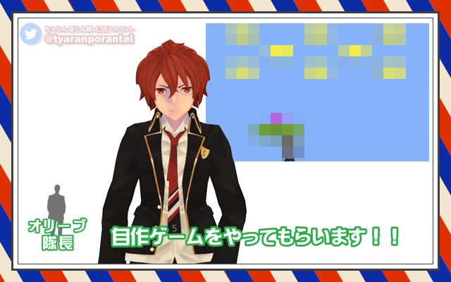 アクロバティックな動きに定評があるVtuberユニット『ちゃらんぽらん隊』の一角。 彼は、2018年5月12日公開の動画では、オリーブ隊長が作成した自作ゲームに挑戦しています。 動画は、息を切らすほど画面内を大きく走り回り、賑やかな内容となっていますが、彼が挑戦したゲームのタイトルはなんだったでしょうか?
