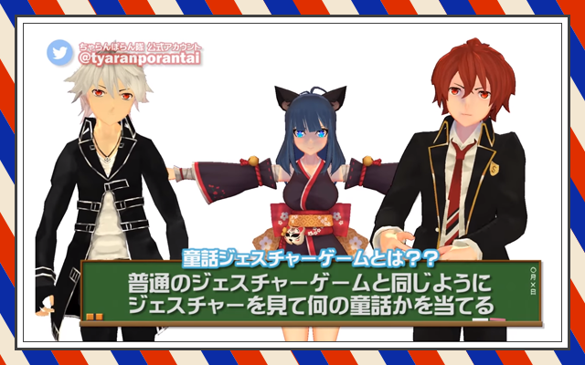 uma・あとり・一角の三人からなるVTuberユニット・ちゃらんぽらん隊。 彼らは、オリーブ隊長からの指令にもとづき、様々なことにチャレンジしています。 2018年5月4日公開「【第4話】童話ジェスチャーゲーム!」では、二人が童話をジェスチャーで表現し残る一人が当てる、というゲームを行っていますが、この動画で正解を出すことができたのは誰でしょうか?